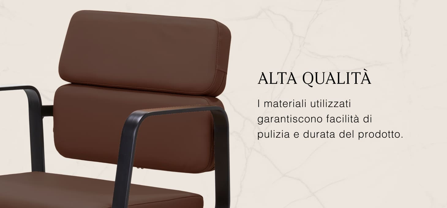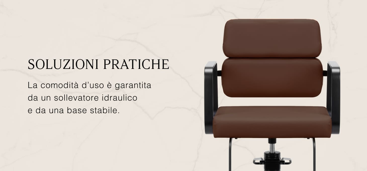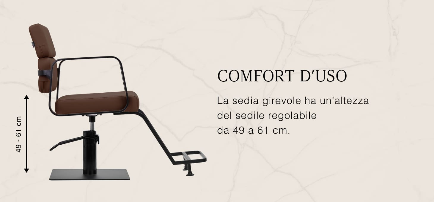 Il resistente sollevatore idraulico consente di regolare il livello della seduta nell'intervallo 49-61 cm, anche quando il cliente è seduto sulla poltrona. Questo sistema offre un ambiente di lavoro più ergonomico, consentendo di regolare il livello della seduta in base all'altezza del cliente e del parrucchiere. Lo schienale, molto interessante dal punto di vista estetico, consente di assumere una posizione comoda, fornendo un eccellente sostegno alla schiena, particolarmente importante per i trattamenti che si protraggono per ore. Un grande vantaggio di questo modello è il foro lasciato tra lo schienale e la seduta. Questo facilita la pulizia del salone, consentendo di spazzare via facilmente i capelli da ogni angolo della poltrona. In questo modo è più facile preparare la postazione di lavoro tra un cliente e l'altro.