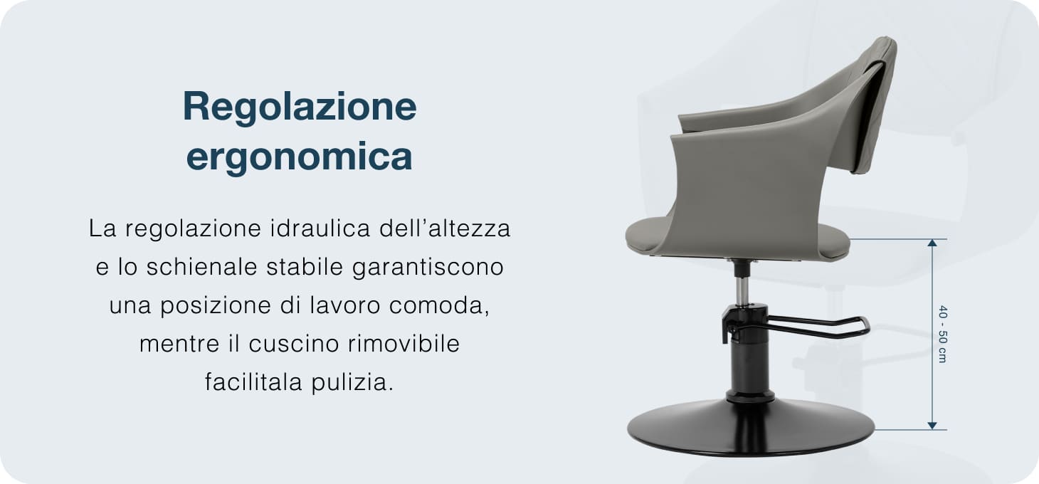 Il resistente sollevatore idraulico consente di regolare l'altezza della seduta entro 40-50 cm, anche durante l'uso. Ciò consente di adattare la poltrona all'altezza del cliente e alle preferenze del parrucchiere, favorendo una posizione di lavoro ergonomica. Lo schienale offre un sostegno stabile alla schiena, particolarmente utile durante i trattamenti più lunghi. Per un maggiore comfort, la poltrona è dotata di un cuscino rivestito in pelle sintetica e fissato con velcro: una soluzione che facilita la pulizia e la manutenzione.