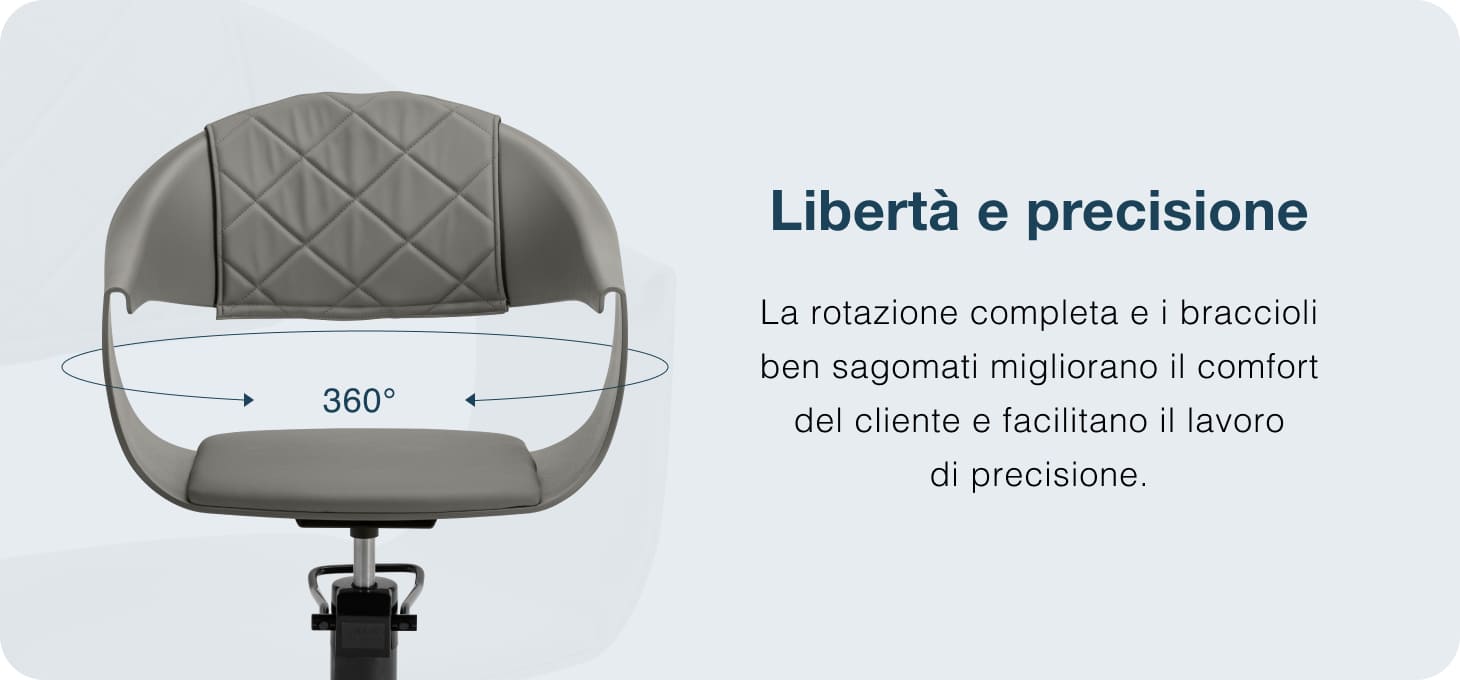 La poltrona è dotata di un meccanismo di rotazione completa per garantire al parrucchiere libertà di movimento e comfort durante il lavoro. I braccioli in plastica, posizionati all'altezza giusta, consentono di posizionare correttamente le spalle del cliente, evitando di ingobbirsi e di piegare la testa. Il design ergonomico facilita l'esecuzione di trattamenti di precisione, mentre la finitura robusta aumenta la durata e il comfort della poltrona, sia per i servizi più brevi che per quelli più lunghi.