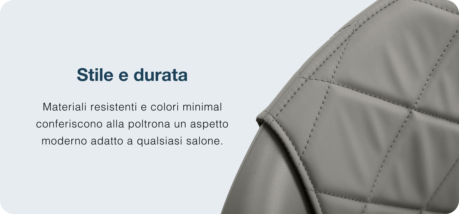 La robusta struttura in plastica grigia garantisce una lunga durata. I materiali utilizzati rendono l'apparecchiatura comoda da usare, resistente all'umidità e facile da pulire. La base rotonda nei toni del nero garantisce stabilità e robustezza. Il colore grigio minimalista, unito alle cuciture estetiche e al nero della base, fa sì che la poltrona si abbini perfettamente a diversi stili di interni di saloni di parrucchieri, introducendo un accento elegante e moderno.