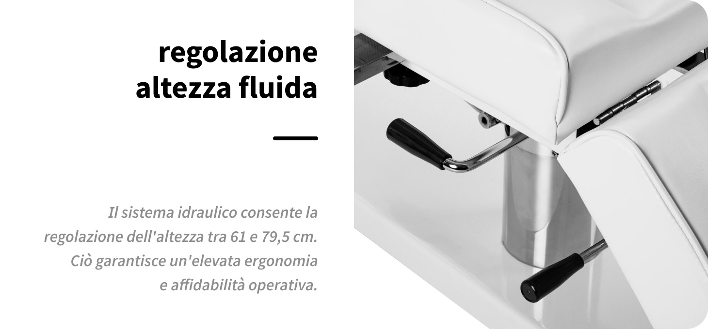 Un efficiente sollevatore idraulico consente una regolazione fluida dell'altezza della seduta in un intervallo compreso tra 61 e 79,5 cm senza l'uso delle mani. Ciò facilita l'adattamento del livello della poltrona all'altezza del professionista e alla natura del trattamento eseguito, favorendo una posizione di lavoro ergonomica e confortevole. Il meccanismo utilizzato si distingue per la sua durata e affidabilità nell'uso quotidiano.