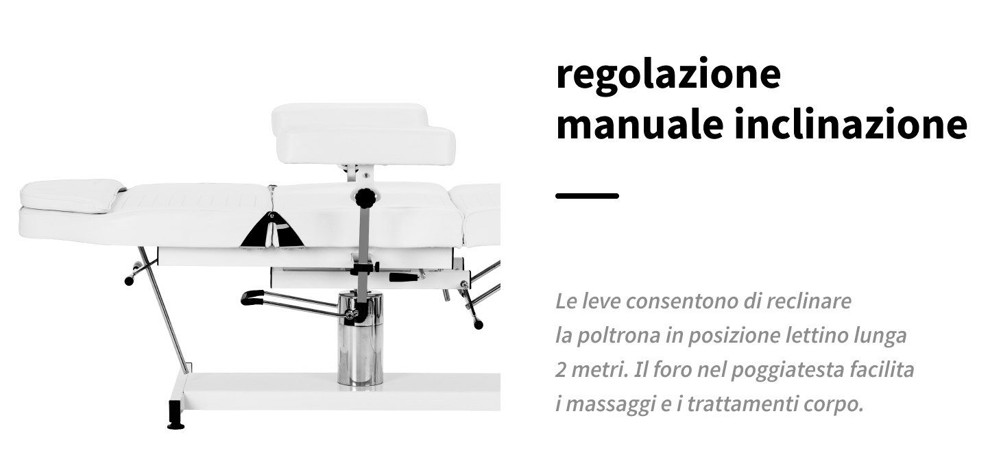 Speciali leve consentono di regolare l'inclinazione dello schienale e del poggiapiedi, permettendo un adattamento preciso delle impostazioni alle esigenze individuali. La poltrona può essere reclinata fino alla posizione di lettino, il che ne aumenta significativamente la funzionalità durante i trattamenti per il viso e il corpo. L'apertura nel poggiatesta, nascosta sotto un cuscino sagomato, rende il modello perfetto anche per i trattamenti eseguiti sulla schiena, come i massaggi. Una volta completamente disteso, la lunghezza della poltrona è di circa 2 metri, garantendo un sostegno stabile per tutto il corpo e un elevato comfort sia per il cliente che per il professionista.