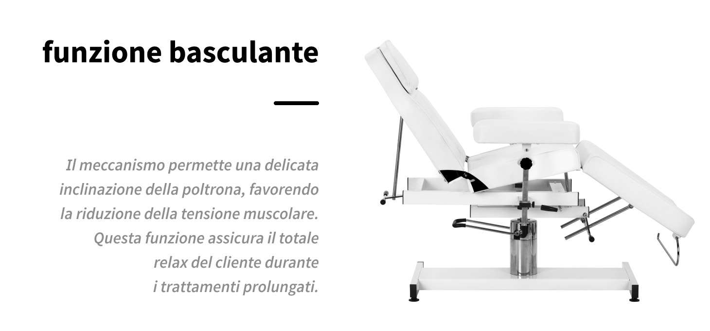 Il meccanismo a dondolo utilizzato consente un leggero inclinamento della poltrona, aumentando il comfort del cliente e favorendo il rilassamento del corpo durante i trattamenti. Questa funzione favorisce la posizione naturale del corpo, contribuendo a ridurre la tensione muscolare e garantendo una piacevole sensazione di relax, in particolare durante trattamenti estetici o massaggi di lunga durata. L'oscillazione consente inoltre di adattare meglio la posizione alle specificità del trattamento eseguito, aumentando il comfort sia del cliente che del professionista.