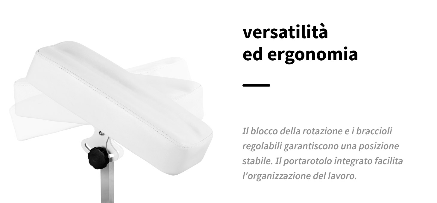 Il meccanismo di rotazione completa facilita l'adattamento della posizione della poltrona al trattamento in corso. L'attuatore dotato di sistema di bloccaggio mantiene stabile la posizione selezionata, garantendo sicurezza e affidabilità durante l'intero trattamento. I braccioli garantiscono un adeguato sostegno delle braccia, favorendo la posizione naturale del corpo e il comfort del cliente; se necessario, possono essere facilmente smontati per ottenere un migliore accesso alla postazione di lavoro. La possibilità di regolarne l'altezza e l'angolo di inclinazione consente di adattare con precisione le impostazioni al tipo di trattamento e alle preferenze individuali dell'utente. Un ulteriore vantaggio è il pratico portarotolo per asciugamani, che facilita l'organizzazione del lavoro.