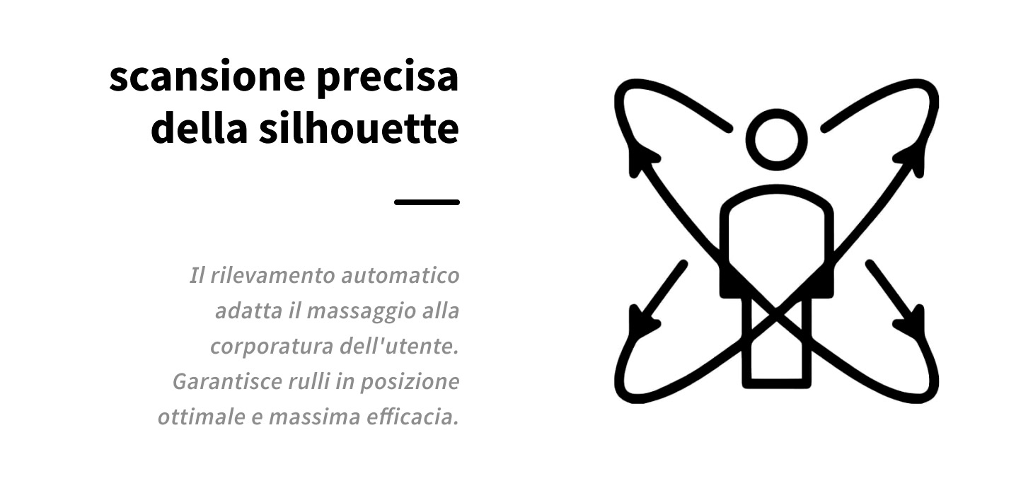 La scansione automatica della silhouette adatta con precisione il massaggio ai parametri individuali dell'utente. Il riconoscimento dell'altezza, della posizione delle spalle e della corporatura consente di impostare i rulli massaggianti, il che si traduce in un adattamento ottimale del massaggio e in una maggiore efficacia. Durante il processo di scansione, i rulli si muovono verso l'alto e verso il basso, mentre la possibilità di correggere le impostazioni dal pannello di controllo consente di adattare ulteriormente il massaggio alle preferenze personali, aumentando il comfort e l'efficacia di ogni sessione.