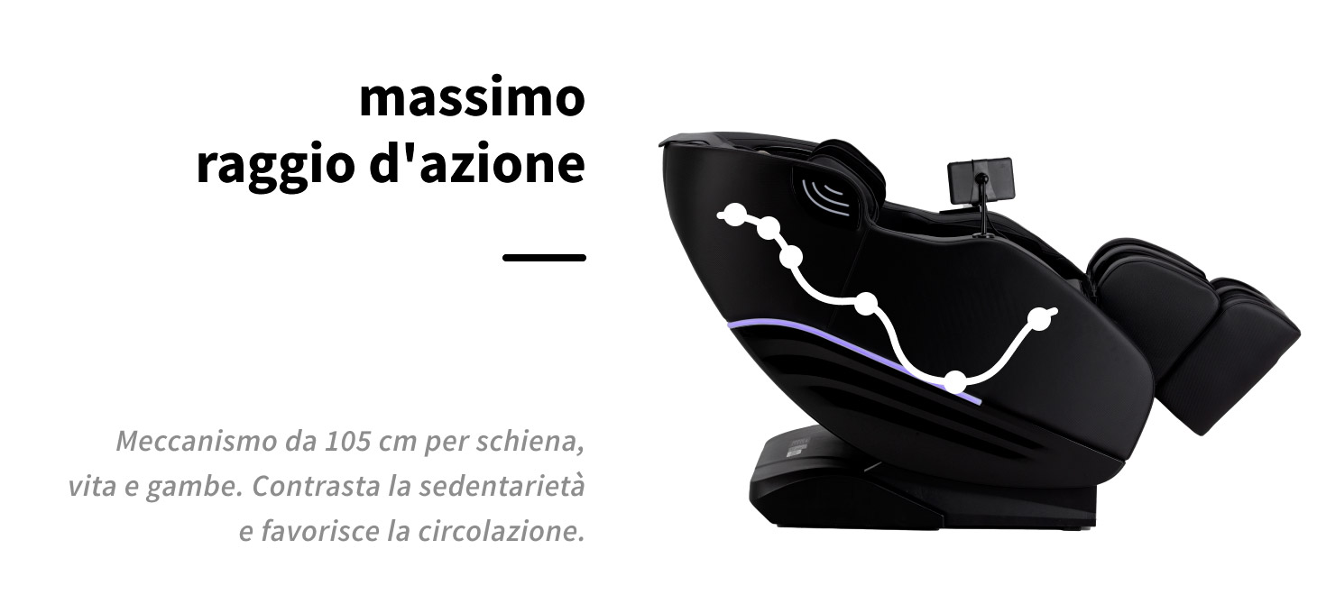 Il percorso di massaggio con i rulli nel modello Maximus 809 copre una lunghezza di 105 centimetri, dal collo alla parte superiore delle gambe. L'area di azione comprende tutta la schiena, compresa la colonna vertebrale toracica e lombare, nonché la vita, i fianchi, i glutei e le cosce. Un percorso di massaggio così esteso consente un trattamento uniforme e completo sia della parte superiore che di quella inferiore del corpo, garantendo un profondo rilassamento muscolare e un netto miglioramento del comfort. Il massaggio favorisce la circolazione sanguigna, aiuta a ridurre la tensione muscolare e favorisce la rigenerazione del corpo dopo una lunga seduta, una giornata di lavoro intensa o uno sforzo fisico.