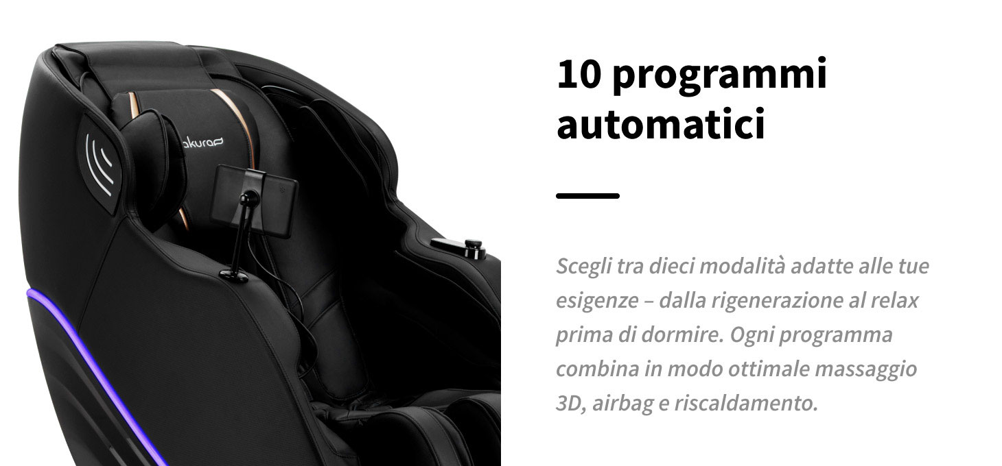 La poltrona ha dieci modalità di massaggio preprogrammate, sviluppate per soddisfare le diverse esigenze degli utenti, dal recupero al relax prima di andare a dormire. Ogni programma combina il lavoro preciso delle testine massaggianti, l'attività dei cuscini ad aria, la regolazione dell'angolo di inclinazione, la funzione Zero Gravity e l'opzione di riscaldamento, garantendo un massaggio completamente personalizzato in base al corpo e al benessere attuale. Basta selezionare la modalità appropriata dal pannello di controllo per godere di un relax ottimale, del massimo comfort e di un efficace rilassamento muscolare.