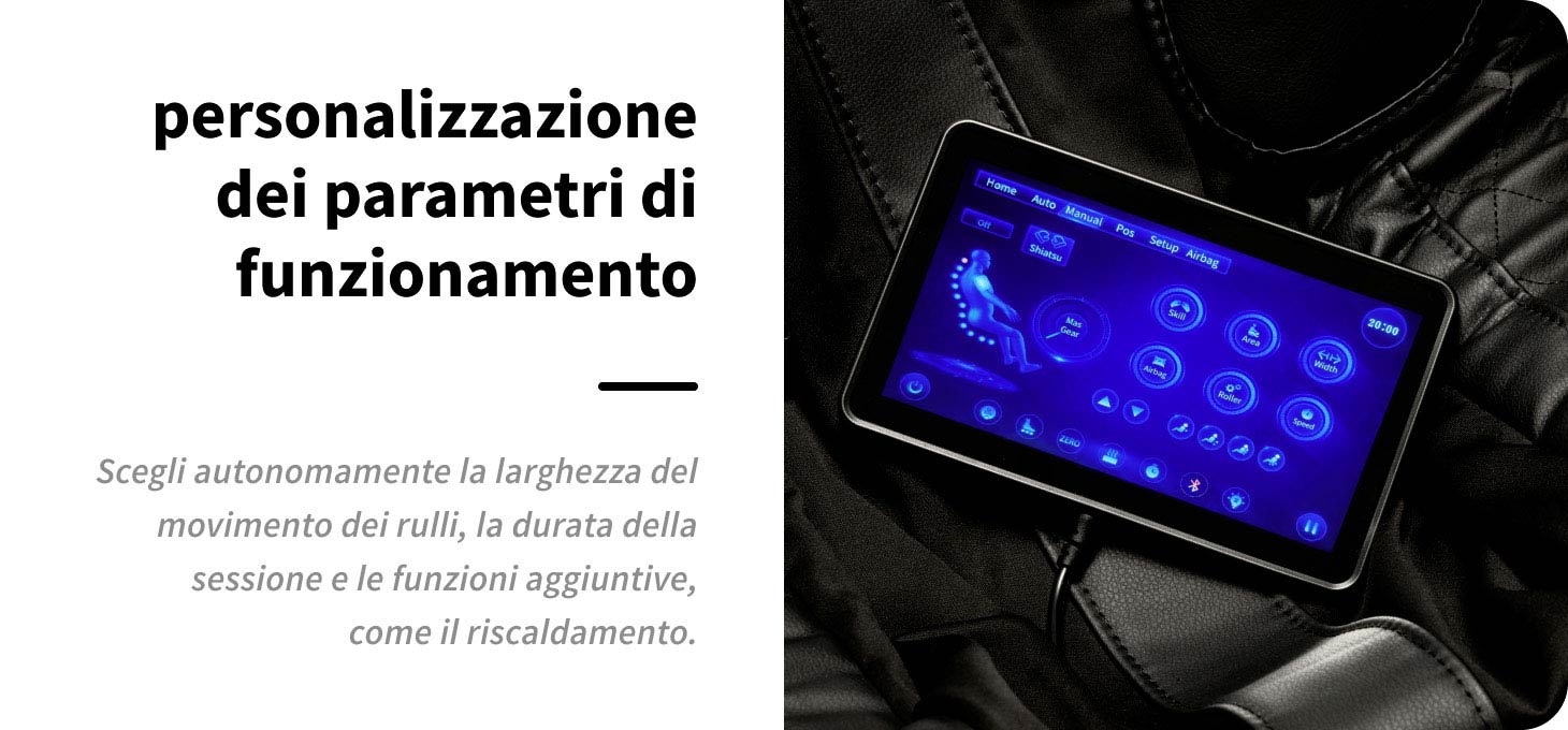 La modalità manuale consente di adattare con precisione il massaggio alle preferenze individuali. L'utente decide autonomamente l'intensità e la velocità di funzionamento delle testine, seleziona l'area di azione e imposta l'ampiezza e la portata del movimento dei rulli nelle singole parti del corpo. Inoltre, è possibile regolare la durata della sessione, attivare la funzione di riscaldamento, attivare la modalità Zero Gravity e controllare i cuscini ad aria in aree selezionate. La modalità manuale è la soluzione ideale per chi apprezza il pieno controllo sul corso del trattamento, consentendo di adattare il massaggio alle esigenze del momento, ottenere il massimo rilassamento muscolare e il pieno comfort durante ogni sessione.