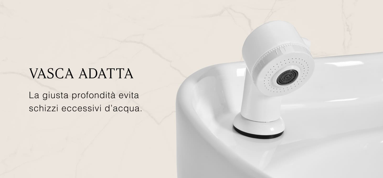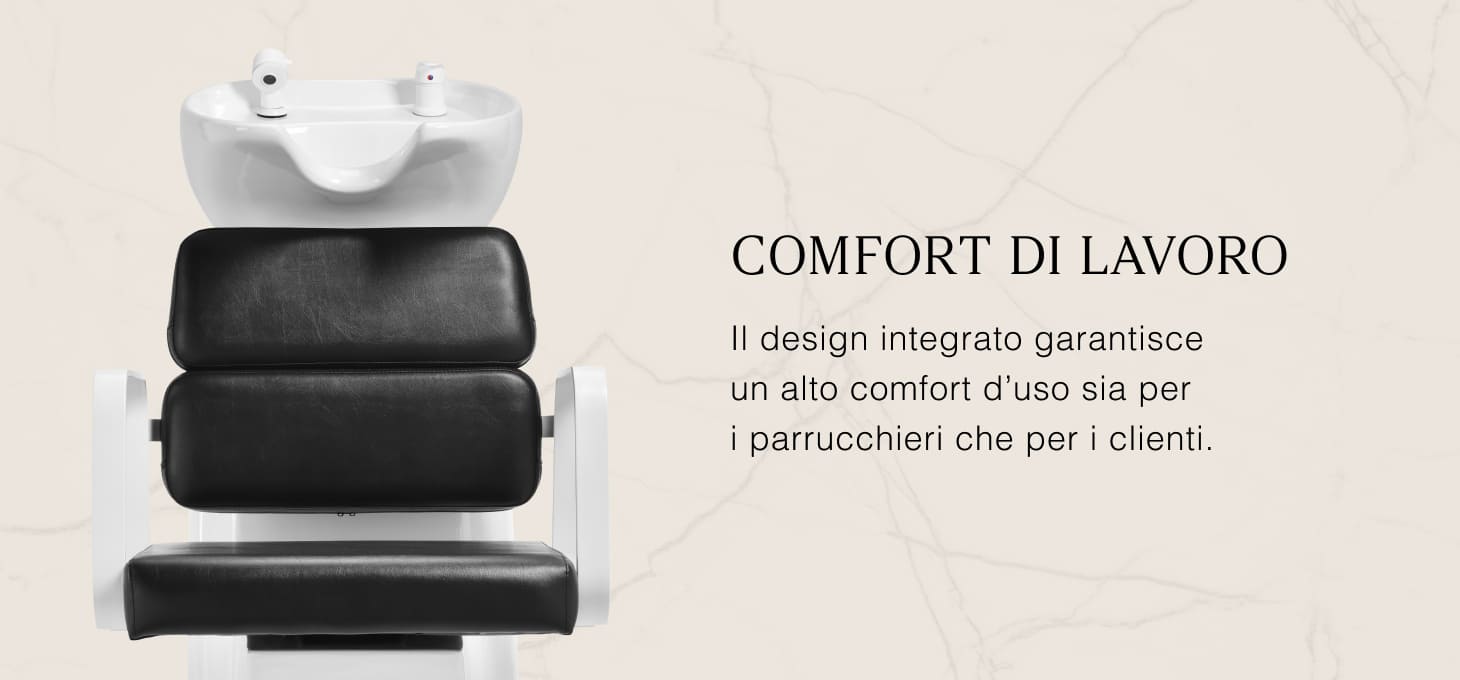 L'adeguata profondità del lavabo in ceramica bianca impedisce l'eccessivo schizzo dell' acqua o dei prodotti utilizzati durante i trattamenti. Ciò consente di eseguire un'ampia gamma di servizi in modo comodo ed efficiente. L'angolo della bacinella può essere regolato, rendendo facile la personalizzazione. L'alta qualità dei materiali utilizzati rende la bacinella durevole, resistente alle macchie e ai graffi e molto facile da pulire. La flangia opportunamente sagomata e lo schienale inclinato offrono sostegno e comfort durante il lavaggio dei capelli e, grazie al comodo rivestimento in plastica nei toni del nero, il cliente non si sentirà a disagio con la freddezza della superficie in ceramica.