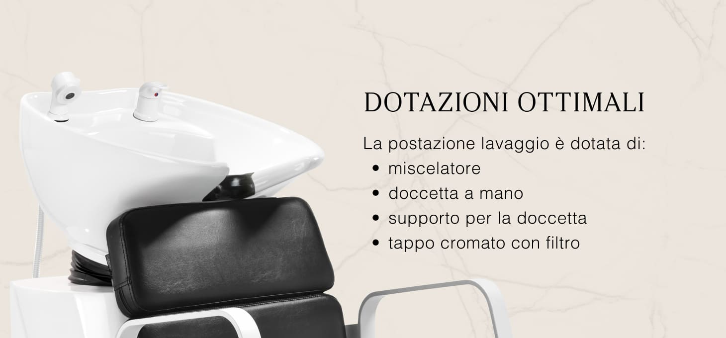 Il pratico lavatesta è dotato di un miscelatore che consente di accedere liberamente all'acqua calda e fredda. In questo modo è facile regolare la temperatura in base alle preferenze del cliente. Un posto dedicato per mettere la cornetta rende il lavoro più efficiente, mentre una spina cromata con uno speciale filtro permette di controllare il flusso dell'acqua e di mantenere elevati standard igienici nel salone. L 'attacco dell'acqua è stato collocato all'interno della base, consentendo di nascondere efficacemente i tubi. Un vantaggio significativo di questo modello è il foro lasciato tra lo schienale e la seduta, che facilita il mantenimento della pulizia nel salone, consentendo di spazzare facilmente lo sporco da ogni angolo della poltrona. Il lavaggio è profilato in modo da assicurare il comfort durante i vari trattamenti, garantendo un adeguato sostegno alla schiena. La combinazione di funzionalità e comfort rende il lavoro in un salone da parrucchiere ancora più confortevole.