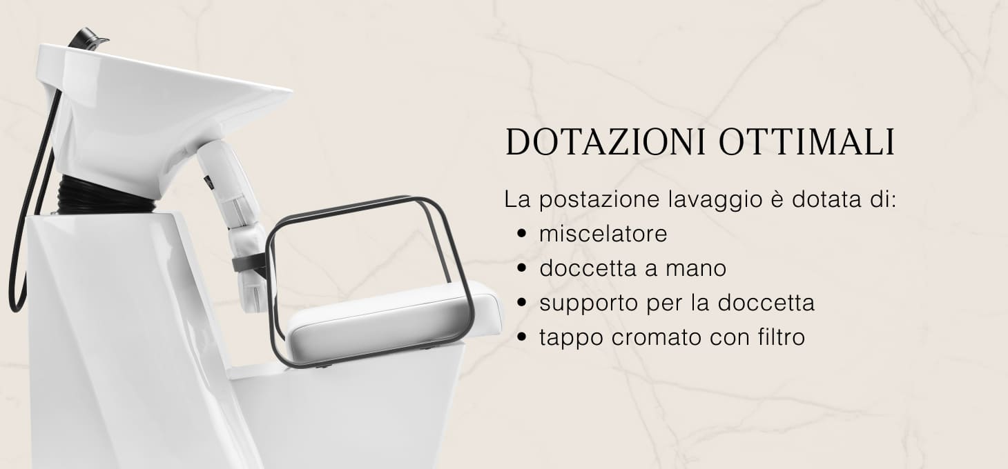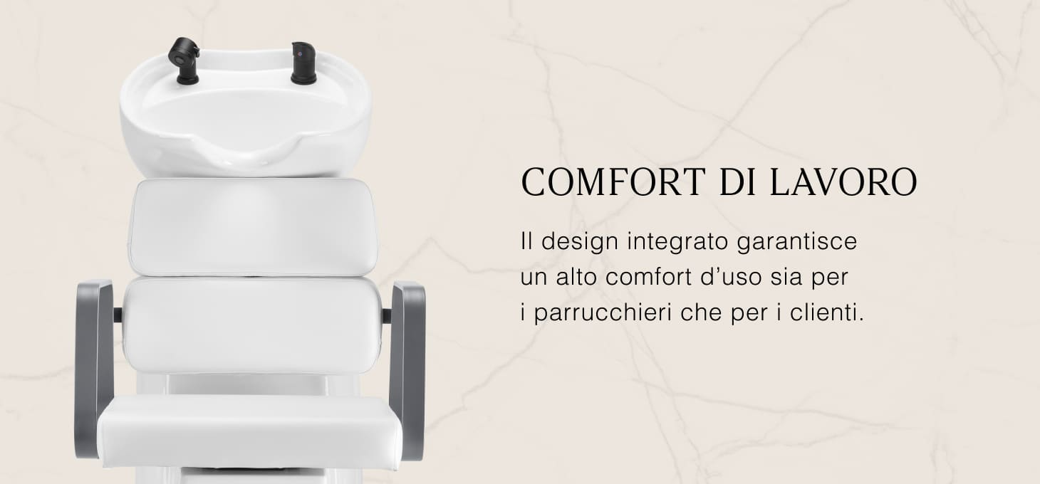 Il pratico lavatesta è dotato di un miscelatore che consente di accedere liberamente all'acqua calda e fredda. In questo modo è facile regolare la temperatura in base alle preferenze del cliente. Un posto dedicato per mettere la cornetta rende il lavoro più efficiente, mentre una spina cromata con uno speciale filtro permette di controllare il flusso dell'acqua e di mantenere elevati standard igienici nel salone. L 'attacco dell'acqua è stato collocato all'interno della base, consentendo di nascondere efficacemente i tubi. Un vantaggio significativo di questo modello è il foro lasciato tra lo schienale e la seduta, che facilita il mantenimento della pulizia nel salone, consentendo di spazzare facilmente lo sporco da ogni angolo della poltrona. Il lavaggio è profilato in modo da assicurare il comfort durante i vari trattamenti, garantendo un adeguato sostegno alla schiena. La combinazione di funzionalità e comfort rende il lavoro in un salone da parrucchiere ancora più confortevole.