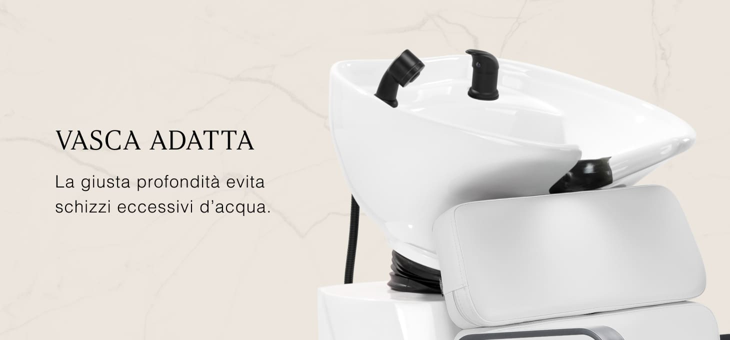 L'adeguata profondità del lavabo in ceramica bianca impedisce l'eccessivo schizzo dell' acqua o dei prodotti utilizzati durante i trattamenti. Ciò consente di eseguire un'ampia gamma di servizi in modo comodo ed efficiente. L'angolo della bacinella può essere regolato, rendendo facile la personalizzazione. L'alta qualità dei materiali utilizzati rende la bacinella durevole, resistente alle macchie e ai graffi e molto facile da pulire. La flangia opportunamente sagomata e lo schienale inclinato offrono sostegno e comfort durante il lavaggio dei capelli e, grazie al comodo rivestimento in plastica nei toni del nero, il cliente non si sentirà a disagio con la freddezza della superficie in ceramica.