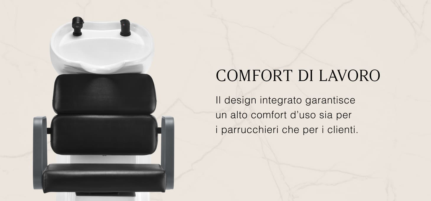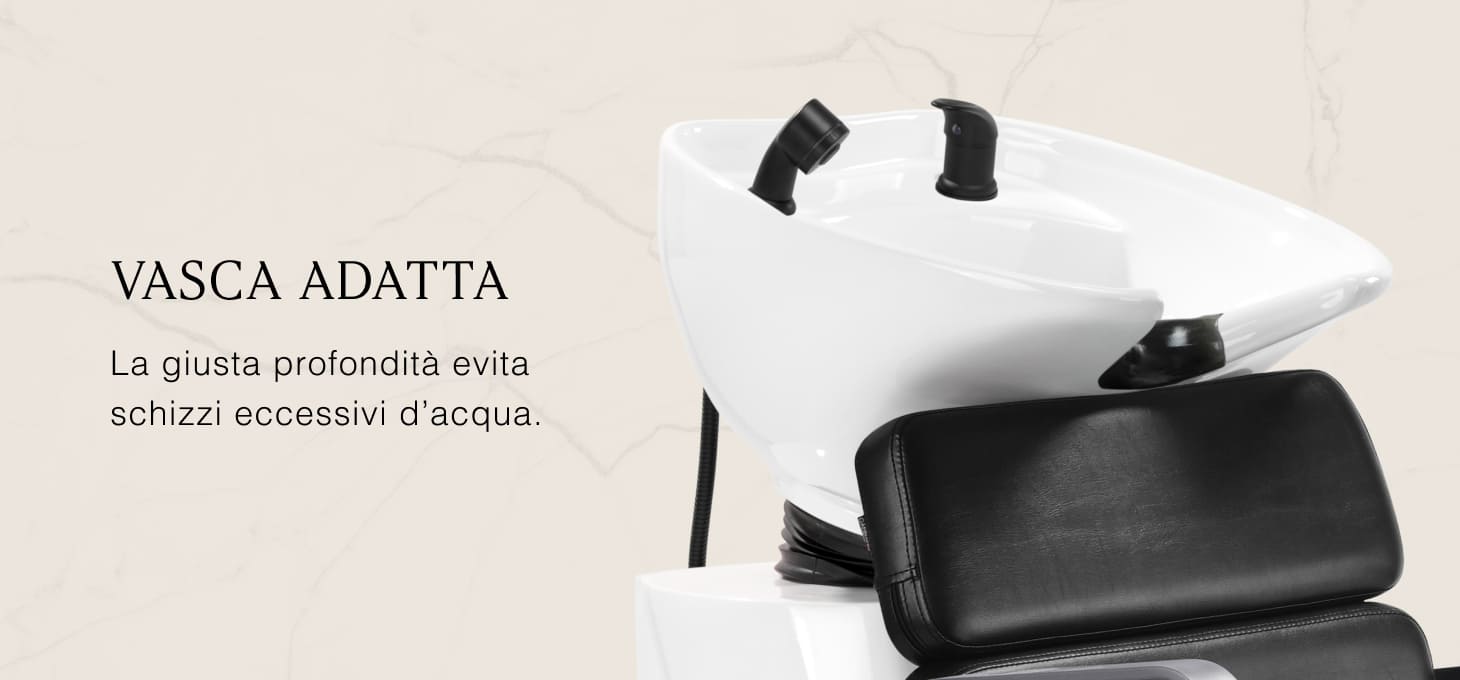 L'adeguata profondità del lavabo in ceramica bianca impedisce l'eccessivo schizzo dell' acqua o dei prodotti utilizzati durante i trattamenti. Ciò consente di eseguire un'ampia gamma di servizi in modo comodo ed efficiente. L'angolo della bacinella può essere regolato, rendendo facile la personalizzazione. L'alta qualità dei materiali utilizzati rende la bacinella durevole, resistente alle macchie e ai graffi e molto facile da pulire. La flangia opportunamente sagomata e lo schienale inclinato offrono sostegno e comfort durante il lavaggio dei capelli e, grazie al comodo rivestimento in plastica nei toni del nero, il cliente non si sentirà a disagio con la freddezza della superficie in ceramica.