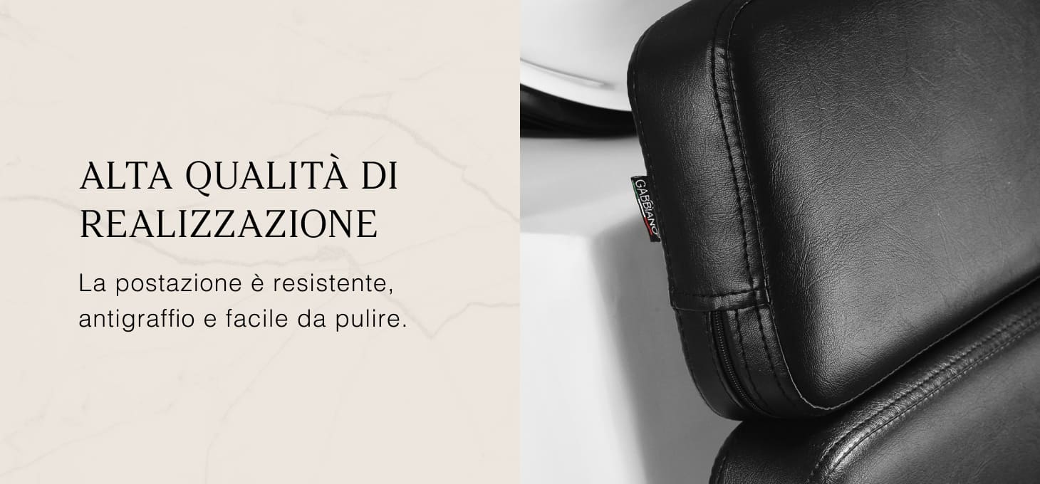 La poltrona profilata offre un adeguato supporto lombare e, di conseguenza, un elevato comfort di utilizzo. I braccioli in metallo nei toni dell'grigio e dalla forma geometrica consentono un corretto posizionamento delle spalle del cliente. L'imbottitura in schiuma durevole e resistente alla deformazione e il rivestimento in pelle sintetica piacevole al tatto nei toni del nero garantiscono la durata del mobile, la facilità di pulizia e l'uso confortevole per lungo tempo. Il design originale ed elegante dell'autolavaggio conferisce agli interni un'espressione unica. La dotazione completa di accessori nei toni del nero, tra cui rubinetto, doccetta e tubi flessibili dedicati, fornisce un set completo di strumenti per il lavoro.