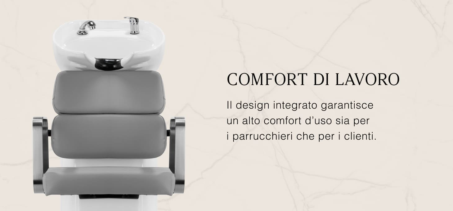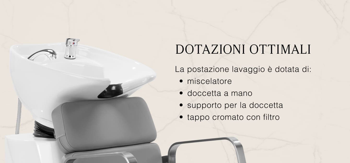 Il pratico lavatesta è dotato di un miscelatore che consente di accedere liberamente all'acqua calda e fredda. In questo modo è facile regolare la temperatura in base alle preferenze del cliente. Un posto dedicato per mettere la cornetta rende il lavoro più efficiente, mentre una spina cromata con uno speciale filtro permette di controllare il flusso dell'acqua e di mantenere elevati standard igienici nel salone. L 'attacco dell'acqua è stato posizionato all'interno della base, consentendo di nascondere efficacemente i tubi. Un vantaggio significativo di questo modello è il foro lasciato tra lo schienale e la seduta, che facilita il mantenimento della pulizia nel salone, consentendo di spazzare facilmente lo sporco da ogni angolo della poltrona. Il lavaggio è profilato in modo da assicurare il comfort durante i vari trattamenti, garantendo un adeguato sostegno alla schiena. La combinazione di funzionalità e comfort rende il lavoro in un salone da parrucchiere ancora più confortevole.