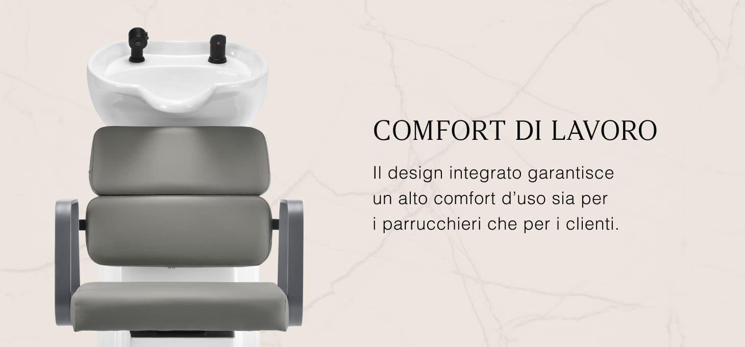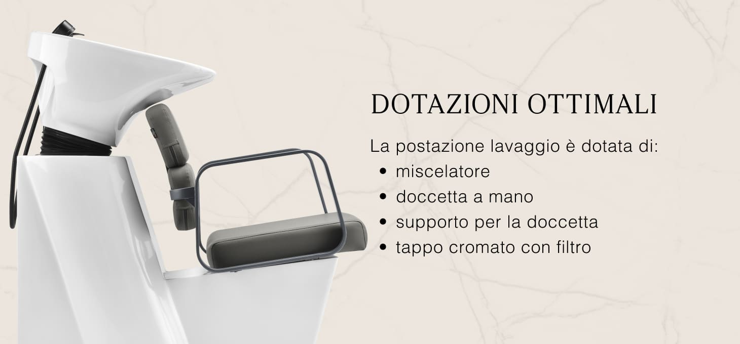 Il pratico lavatesta è dotato di un miscelatore che consente di accedere liberamente all'acqua calda e fredda. In questo modo è facile regolare la temperatura in base alle preferenze del cliente. Un posto dedicato per mettere la cornetta rende il lavoro più efficiente, mentre una spina cromata con uno speciale filtro permette di controllare il flusso dell'acqua e di mantenere elevati standard igienici nel salone. L 'attacco dell'acqua è stato collocato all'interno della base, consentendo di nascondere efficacemente i tubi. Un vantaggio significativo di questo modello è il foro lasciato tra lo schienale e la seduta, che facilita il mantenimento della pulizia nel salone, consentendo di spazzare facilmente lo sporco da ogni angolo della poltrona. Il lavaggio è profilato in modo da assicurare il comfort durante i vari trattamenti, garantendo un adeguato sostegno alla schiena. La combinazione di funzionalità e comfort rende il lavoro in un salone da parrucchiere ancora più confortevole.