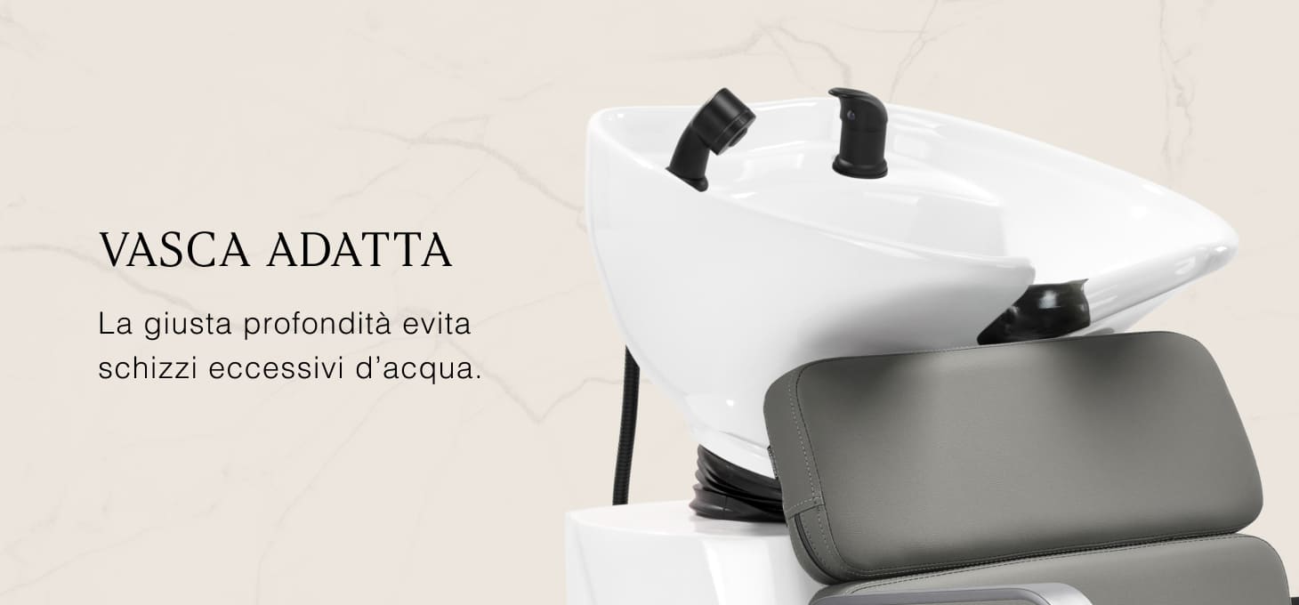 L'adeguata profondità del lavabo in ceramica bianca impedisce l'eccessivo schizzo dell' acqua o dei prodotti utilizzati durante i trattamenti. Ciò consente di eseguire un'ampia gamma di servizi in modo comodo ed efficiente. L'angolo della bacinella può essere regolato, rendendo facile la personalizzazione. L'alta qualità dei materiali utilizzati rende la bacinella durevole, resistente alle macchie e ai graffi e molto facile da pulire. La flangia opportunamente sagomata e lo schienale inclinato offrono sostegno e comfort durante il lavaggio dei capelli e, grazie al comodo rivestimento in plastica nei toni del nero, il cliente non si sentirà a disagio con la freddezza della superficie in ceramica.