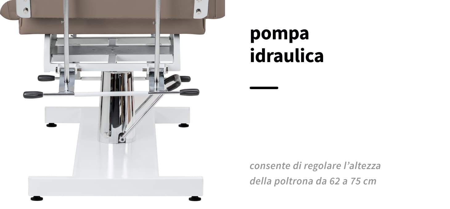 L'altezza della poltrona può essere regolata a mani libere tra 62 e 75 cm grazie a una pompa idraulica. In questo modo l 'apparecchiatura può essere utilizzata comodamente da persone di diverse altezze e può essere adattata alle esigenze individuali del cliente e dell'operatore. Il meccanismo utilizzato è molto resistente e affidabile. Grazie all'apertura nel poggiatesta, nascosta sotto un cuscino opportunamente sagomato, la poltrona è ideale anche per i trattamenti effettuati sulla schiena, come i massaggi.