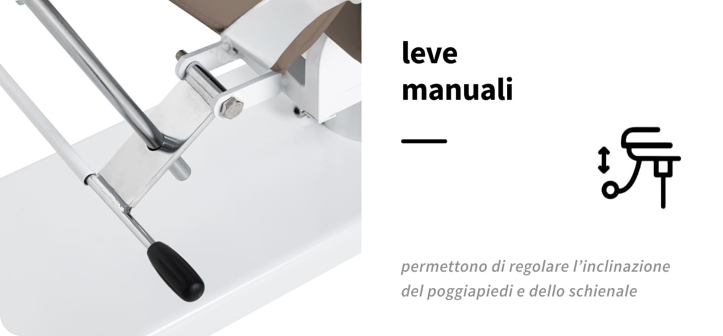 Grazie a speciali leve, è possibile regolare in continuo gli angoli di posizionamento del poggiapiedi e dello schienale. Ciò consente di adattare in modo ottimale le impostazioni alle esigenze individuali, per un trattamento e un comfort corretti e confortevoli. La poltrona può essere estesa fino alla posizione reclinabile, il che aumenta notevolmente la sua funzionalità per i trattamenti del viso e del corpo.