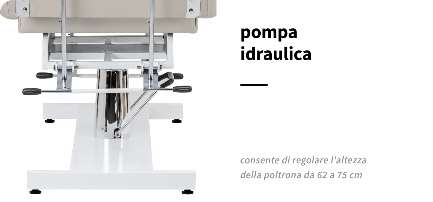 L'altezza della poltrona può essere regolata a mani libere tra 62 e 75 cm grazie a una pompa idraulica. In questo modo l 'apparecchiatura può essere utilizzata comodamente da persone di diverse altezze e può essere adattata alle esigenze individuali del cliente e dell'operatore. Il meccanismo utilizzato è molto resistente e affidabile. Grazie all'apertura nel poggiatesta, nascosta sotto un cuscino opportunamente sagomato, la poltrona è ideale anche per i trattamenti effettuati sulla schiena, come i massaggi.