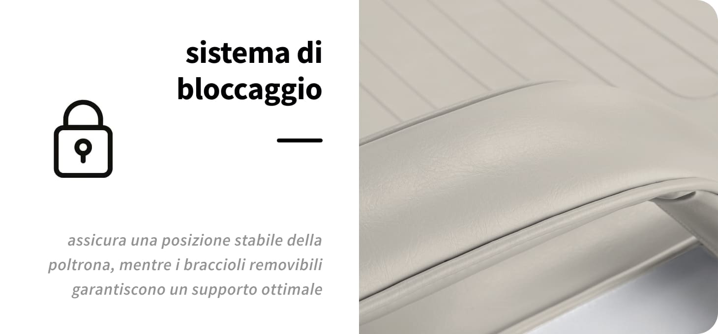 La poltrona è in grado di effettuare una rotazione completa, che consente di adattarsi al trattamento in corso in qualsiasi momento. L'attuatore è dotato di un sistema di bloccaggio integrato, in modo che, una volta impostata la posizione prescelta, l'apparecchiatura la mantenga in modo stabile. I braccioli garantiscono un sostegno adeguato e possono essere facilmente rimossi se necessario. Questi elementi, divisi a metà, sono mobili, quindi si appoggiano bene quando si cambia la posizione dello schienale.