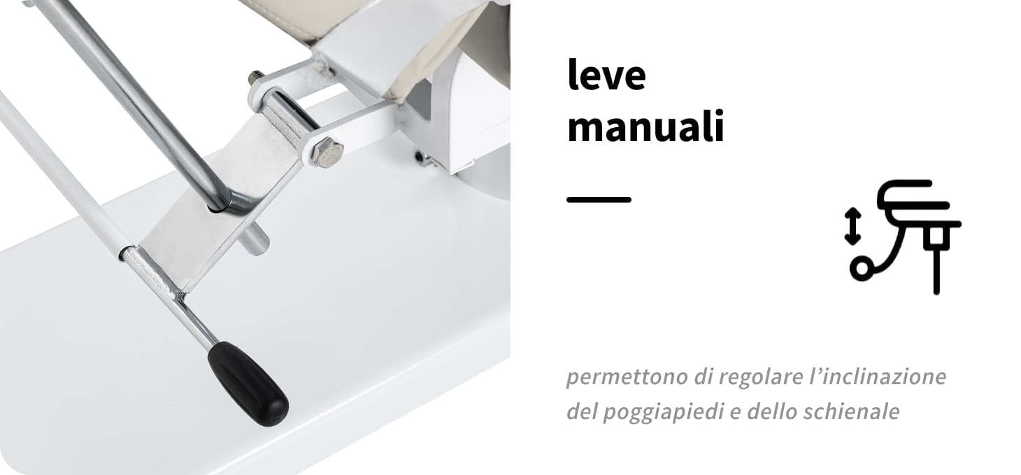 Grazie a speciali leve, è possibile regolare in continuo gli angoli di posizionamento del poggiapiedi e dello schienale. Ciò consente di adattare in modo ottimale le impostazioni alle esigenze individuali, per un trattamento e un comfort corretti e confortevoli. La poltrona può essere estesa fino alla posizione reclinabile, il che aumenta notevolmente la sua funzionalità per i trattamenti del viso e del corpo.