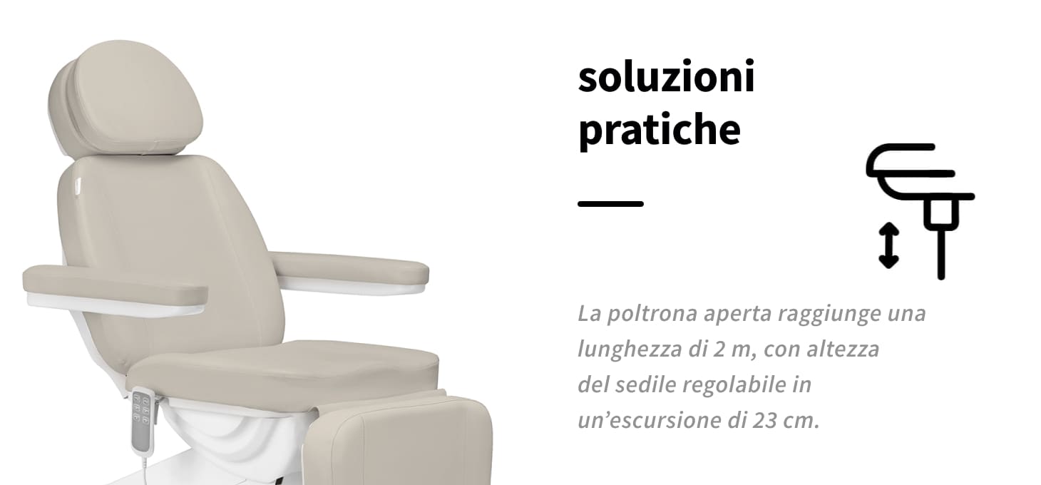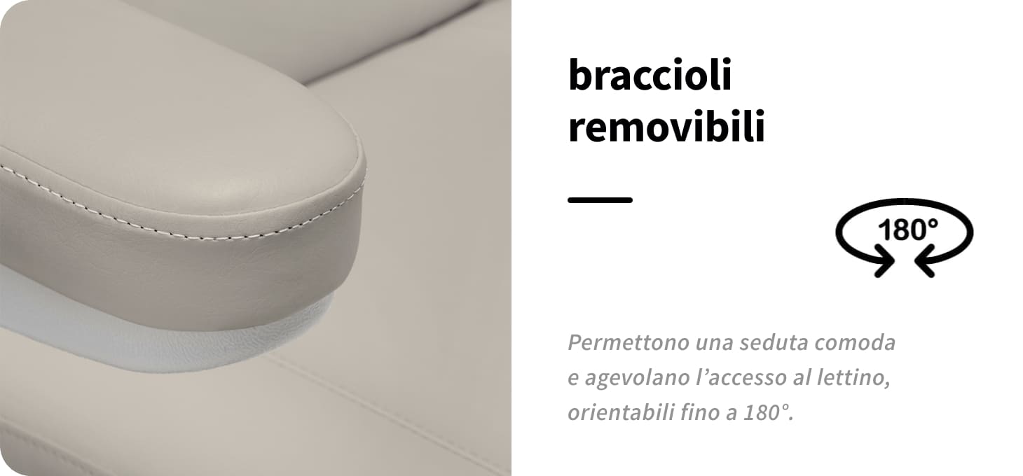 Il poggiatesta estensibile aiuta ad adattare l'apparecchiatura a utenti di diverse altezze, fornendo un supporto stabile per la testa durante i trattamenti. È inoltre possibile regolare l'estensione del poggiapiedi, che sarà particolarmente utile per i trattamenti su persone più alte, fornendo loro un sostegno migliore. I braccioli sono mobili in un raggio di 180º, facilitando una seduta efficiente e un accesso confortevole per l'operatore. Se necessario, possono essere facilmente e rapidamente rimossi.