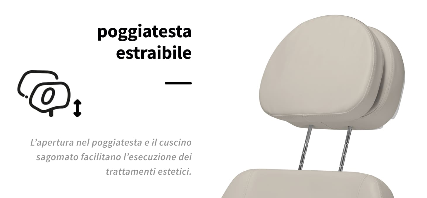 L'ampio sedile garantisce il comfort durante i trattamenti prolungati. Il modo in cui la schiuma è stata modellata conferisce alla poltrona una forma ergonomica e permette al corpo di sedersi comodamente, garantendo un elevato livello di comfort e un adeguato sostegno alla colonna vertebrale. L'apparecchiatura può essere dispiegata in posizione reclinabile e, grazie all'apertura nascosta nel poggiatesta sotto il cuscino, è ideale anche per trattamenti alla schiena o massaggi.