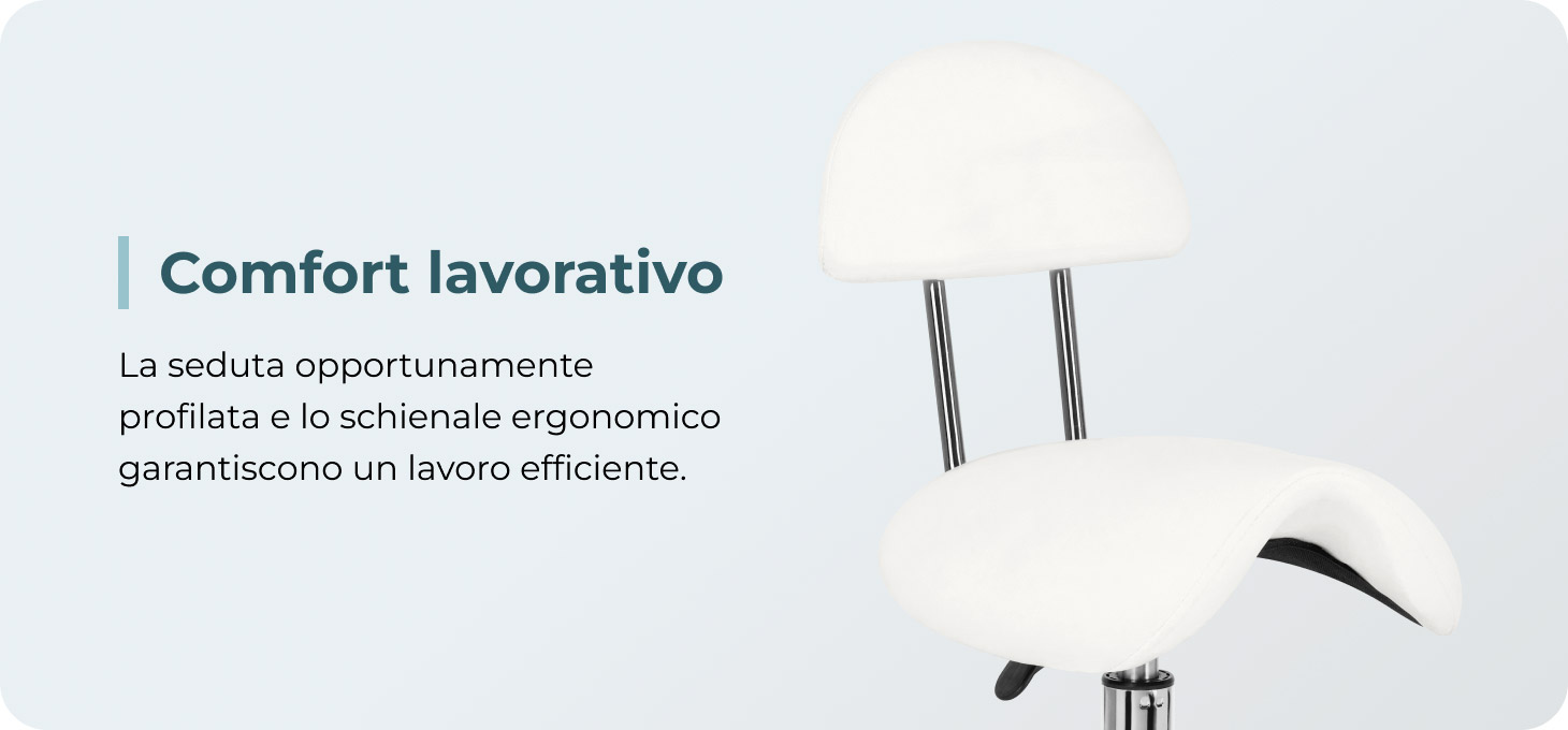 La possibilità di regolare l'altezza della seduta tra 49 e 62 cm facilita al professionista il corretto posizionamento del corpo durante l'esecuzione dei servizi. La seduta sagomata a forma di sella, imbottita con schiuma resistente e indeformabile, garantisce agli utenti comfort ed ergonomia di lavoro. Il comodo schienale offre un eccellente sostegno alla schiena, indipendentemente dall'altezza dell'utente. Il meccanismo di rotazione completa rende il lavoro più efficiente e confortevole.