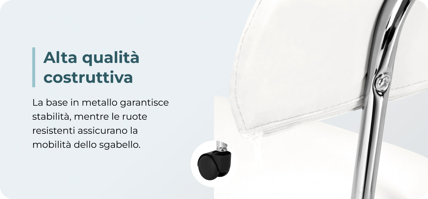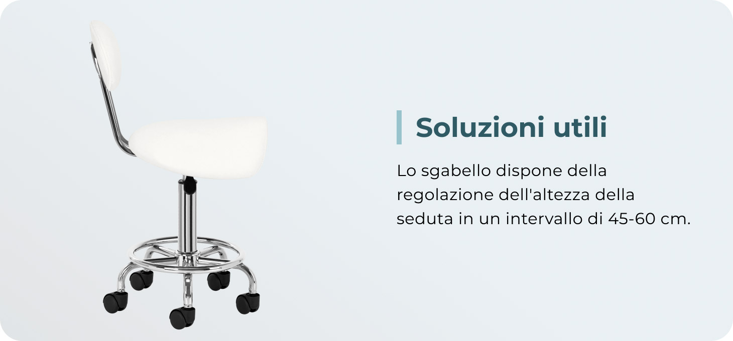 La base a cinque razze in tonalità cromate è dotata di ruote che garantiscono una notevole mobilità, facilitando lo spostamento del mobile all'interno dell'ambulatorio. Il rivestimento dello sgabello è realizzato in similpelle piacevole al tatto in tonalità bianco. Grazie all'utilizzo di questo materiale , lo sgabello è resistente, impermeabile e facile da pulire.