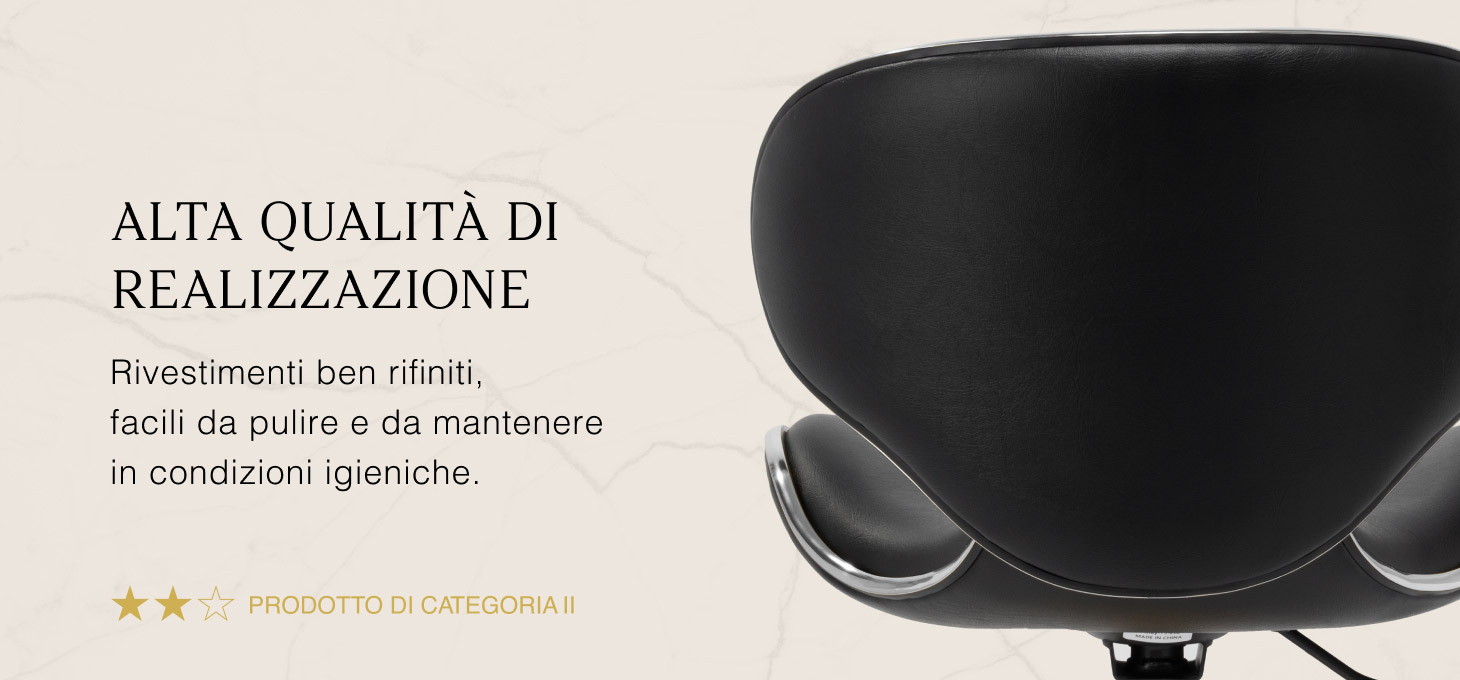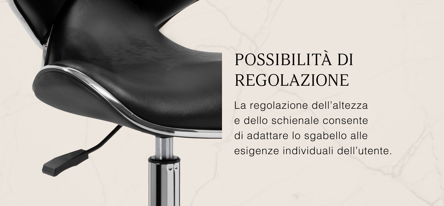 La base a cinque stelle garantisce stabilità anche durante i movimenti più dinamici o i frequenti cambi di posizione. Dotata di ruote robuste, garantisce un'elevata mobilità, consentendo di muoversi liberamente nel salone o in ufficio. Rivestimento in pelle sintetica nei toni del nero, non solo resistente ma anche facile da mantenere pulito. Gli elementi estetici in tonalità cromate aggiungono un tocco di lusso e attirano l'attenzione. La combinazione unica di eleganza e comfort rende lo sgabello uno strumento indispensabile per il lavoro di ogni professionista.