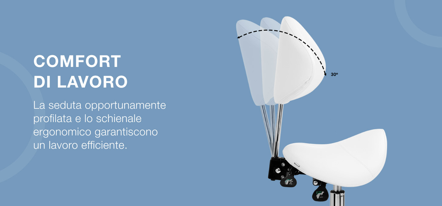 La possibilità di regolare l'altezza del sedile nell'intervallo 50-64 cm consente allo specialista di assumere la posizione appropriata durante l'esecuzione dei servizi. Lo schienale sagomato, estendibile di 20 cm, offre un eccellente sostegno alla schiena, indipendentemente dall'altezza dell'utente. Il meccanismo di rotazione completa rende il lavoro più efficiente e confortevole. La sedia è inoltre dotata di una funzione culla bloccabile per un posizionamento ergonomico del corpo durante il lavoro. Il sedile, a forma di sella e imbottito di schiuma indeformabile, garantisce agli utenti comfort e condizioni di lavoro ergonomiche.