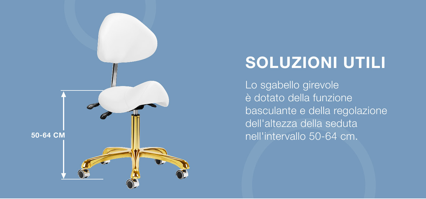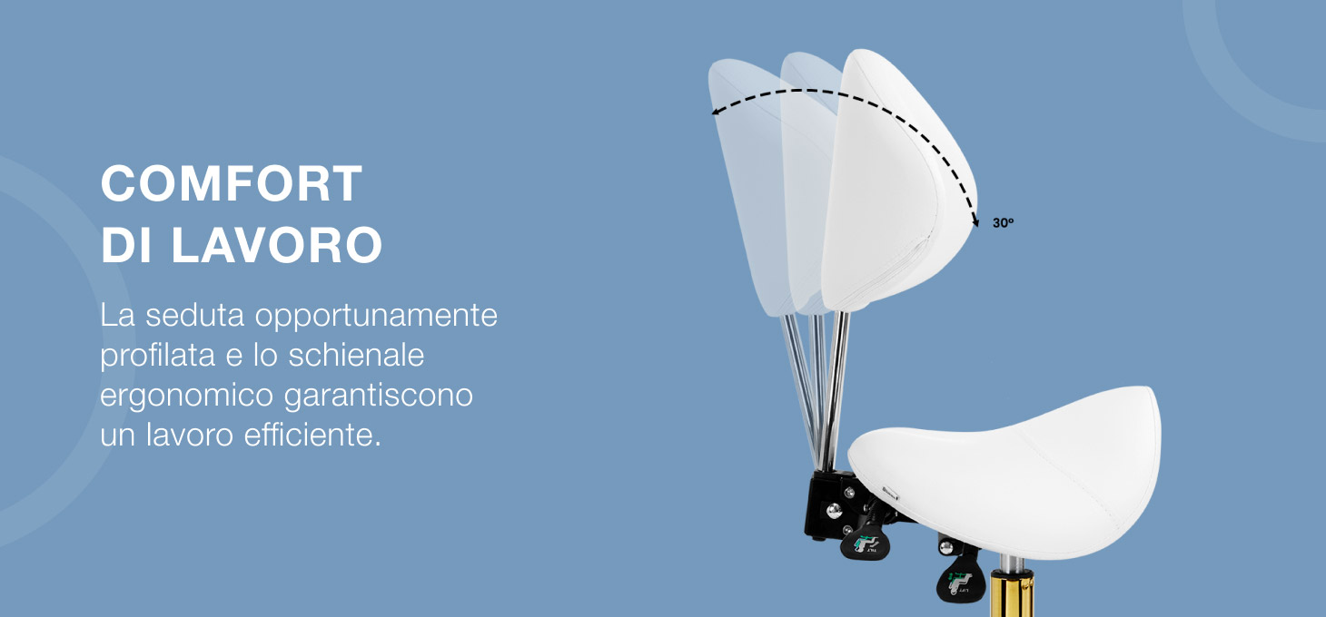 La possibilità di regolare l'altezza del sedile nell'intervallo 50-64 cm consente allo specialista di assumere la posizione appropriata durante l'esecuzione dei servizi. Lo schienale sagomato, estendibile di 20 cm, offre un eccellente sostegno alla schiena, indipendentemente dall'altezza dell'utente. Il meccanismo di rotazione completa rende il lavoro più efficiente e confortevole. La sedia è inoltre dotata di una funzione culla bloccabile per un posizionamento ergonomico del corpo durante il lavoro. Il sedile, a forma di sella e imbottito di schiuma indeformabile, garantisce agli utenti comfort e condizioni di lavoro ergonomiche.