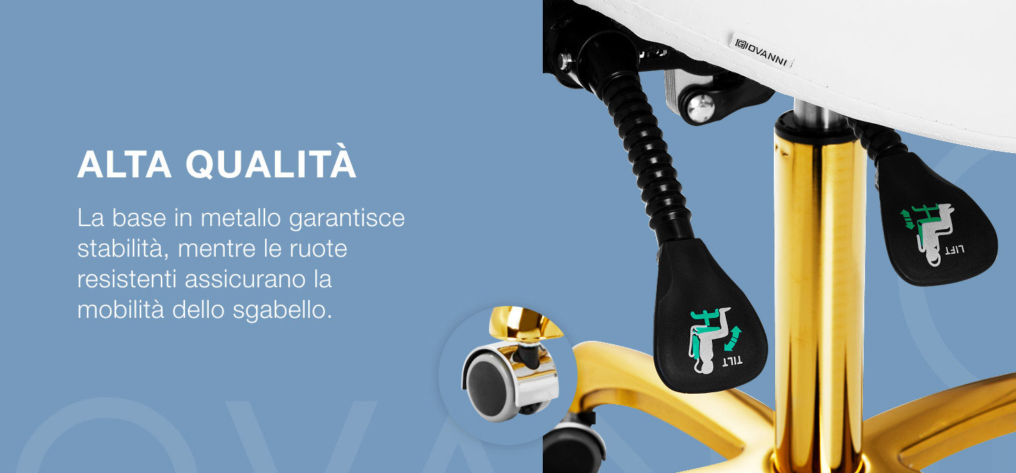 La base a cinque stelle, opportunamente progettata nei toni dell'oro, rende lo sgabello stabile anche durante il lavoro intensivo. Le rotelle garantiscono una notevole mobilità, facilitando lo spostamento del mobile in ufficio. Il rivestimento dello sgabello è in finta pelle nei toni del bianco. Grazie all'utilizzo di questo materiale, lo sgabello è resistente all'umidità e facile da pulire.