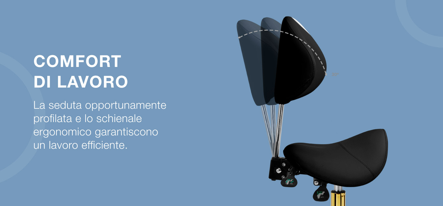 La possibilità di regolare l'altezza del sedile nell'intervallo 50-64 cm consente allo specialista di assumere la posizione appropriata durante l'esecuzione dei servizi. Lo schienale sagomato, estendibile di 20 cm, offre un eccellente sostegno alla schiena, indipendentemente dall'altezza dell'utente. Il meccanismo di rotazione completa rende il lavoro più efficiente e confortevole. La sedia è inoltre dotata di una funzione culla bloccabile per un posizionamento ergonomico del corpo durante il lavoro. Il sedile, a forma di sella e imbottito di schiuma indeformabile, garantisce agli utenti comfort e condizioni di lavoro ergonomiche.