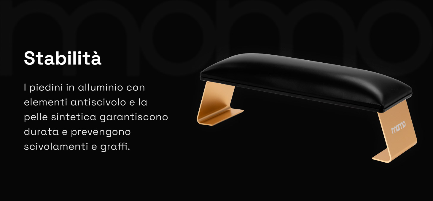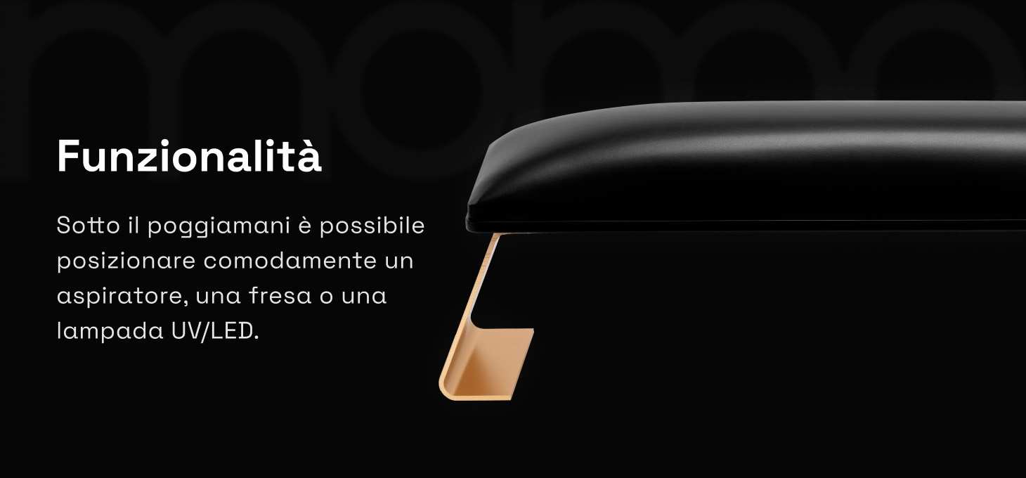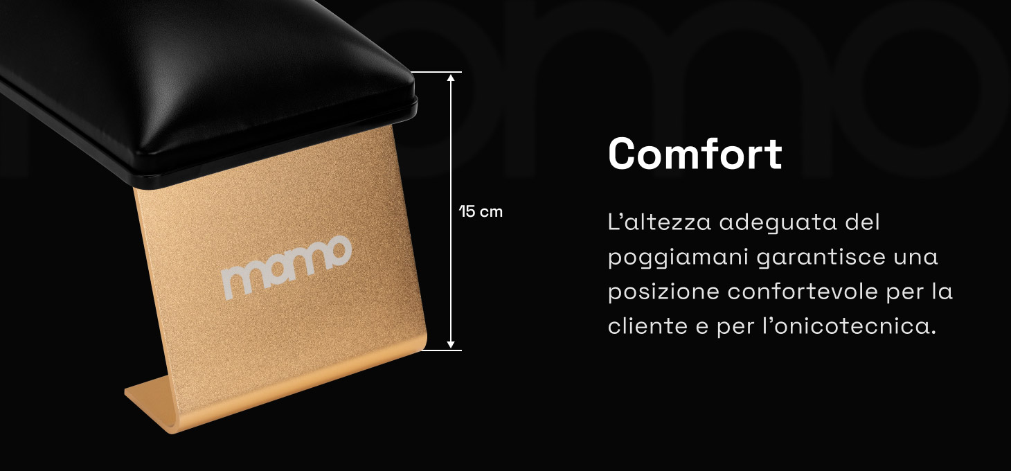 Il supporto stabile per le mani facilita l'esecuzione precisa della stilizzazione e la libera manovrabilità della mano della cliente, il che si traduce in un maggiore comfort durante il trattamento e in una maggiore efficienza del lavoro. L'altezza del supporto, opportunamente regolata, favorisce il mantenimento di una posizione comoda sia per la cliente che per la stilista. La posizione ergonomica della mano aiuta a ridurre la tensione nella zona della schiena e della colonna vertebrale, favorendo il comfort di lavoro anche durante trattamenti di molte ore.
