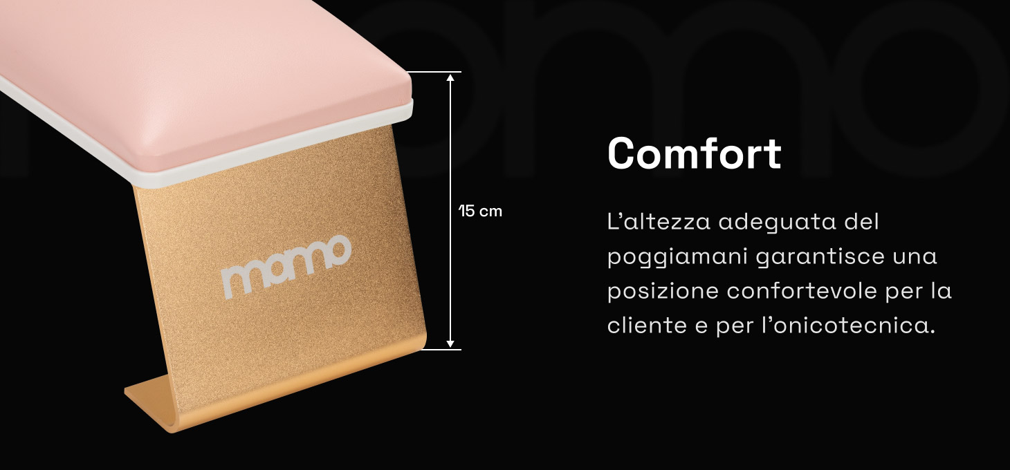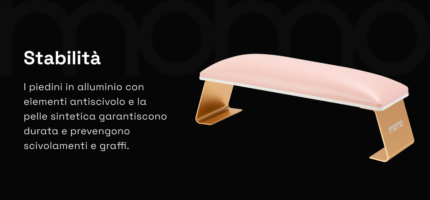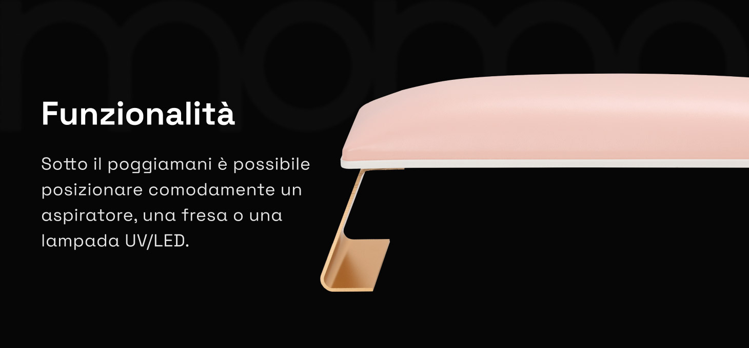 Il supporto stabile per le mani facilita l'esecuzione precisa della stilizzazione e la libera manovrabilità della mano della cliente, il che si traduce in un maggiore comfort durante il trattamento e in una maggiore efficienza del lavoro. L'altezza del supporto, opportunamente regolata, favorisce il mantenimento di una posizione comoda sia per la cliente che per la stilista. La posizione ergonomica della mano aiuta a ridurre la tensione nella zona della schiena e della colonna vertebrale, favorendo il comfort di lavoro anche durante trattamenti di molte ore.