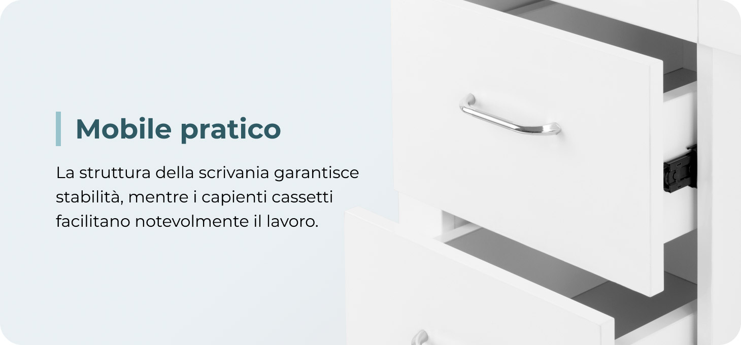 Gli armadietti su entrambi i lati con tre capienti cassetti facilitano l'organizzazione e l'ordine dei cosmetici e degli strumenti più necessari. In questo modo, i prodotti necessari sono sempre a portata di mano, il che si traduce in efficienza sul lavoro. La scrivania è dotata di apposite aperture nella parte superiore per i cavi delle apparecchiature essenziali, che consentono di mantenere facilmente la postazione di lavoro in ordine ed esteticamente gradevole.