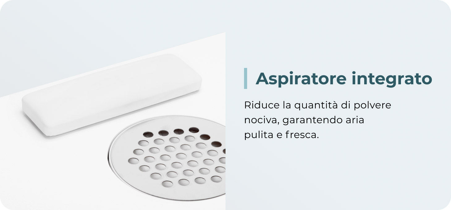 L'innovativo assorbitore di polvere a cassetta integrato nel piano del tavolo migliora notevolmente il comfort e l'igiene del lavoro, rimuovendo efficacemente la polvere generata durante i trattamenti cosmetici come la manicure. Grazie a questo dispositivo, l'aria del salone rimane pulita e l'area di lavoro priva di contaminazioni, aumentando la sicurezza sia per l'estetista che per i clienti. L'assorbitore di polvere è facile da usare e da mantenere, il che ne aumenta la funzionalità. È possibile acquistare un filtro a cartuccia di ricambio per l'assorbitore (SKU 132085).